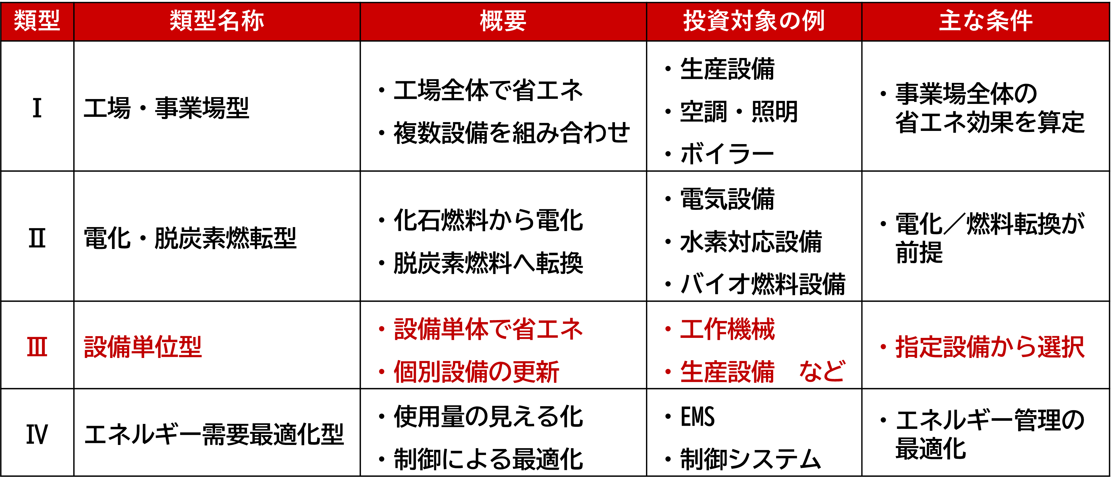 特定の設備購入に向いている(Ⅲ)設備単位型での申請が可能です。