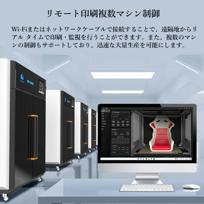 Wi-Fiまたはネットワークケーブルで接続することで、遠隔地からリアル タイムで印刷・監視を行うことができます。また、複数のマシンの制御もサポートしており、迅速な大量生産を可能にします。