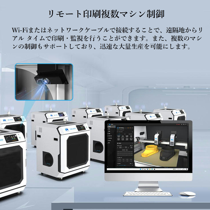 Wi-Fiまたはネットワークケーブルで接続することで、遠隔地からリアル タイムで印刷・監視を行うことができます。また、複数のマシンの制御もサポートしており、迅速な大量生産を可能にします。
