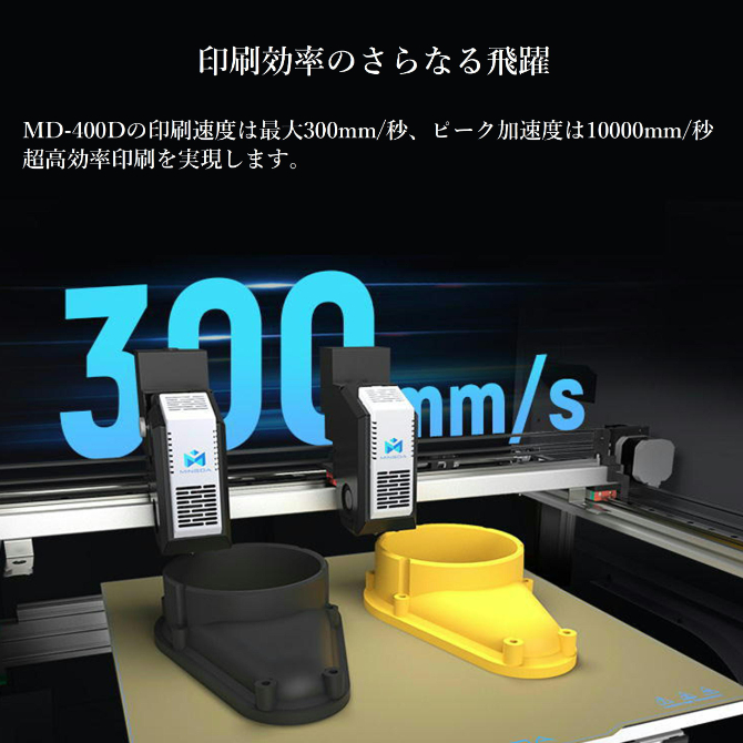MD-400Dの印刷速度は最大300mm/秒、ピーク加速度は10000mm/秒超高効率印刷を実現します。