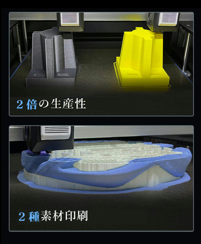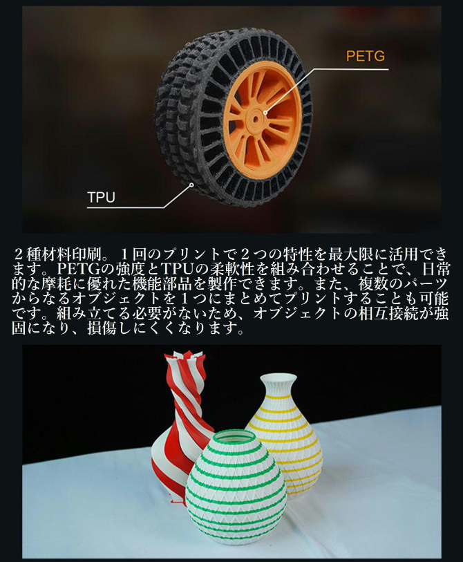 1回のプリントで2つの特性を最大限に活用できます。PETGの強度とTPUの柔軟性を組み合わせることで、日常的な摩耗に優れた機能部品を製作できます。また、複数のパーツからなるオブジェクトを1つにまとめてプリントすることも可能です。組み立てる必要がないため、オブジェクトの相互接続が強固になり、損傷しにくくなります。